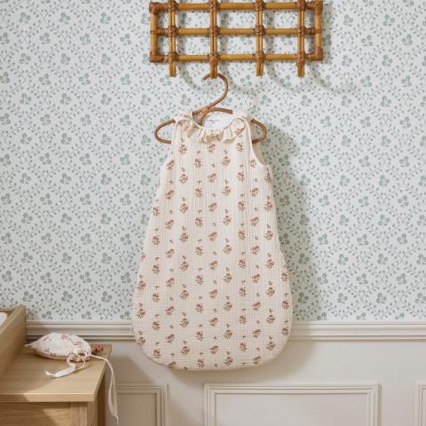 Gigoteuse à col volanté en gaze de coton biologique. Son indice CHALEUR est de 2 (TOG 2). Cet indice standard est idéal dans une chambre dont la température se situe entre 18 et 22 degrés. Fermeture par pressions épaules + glissière sur le côté pour un enfilage facile. 2 tailles au choix : 65 cm (0/6 mois) et 90 cm (6/