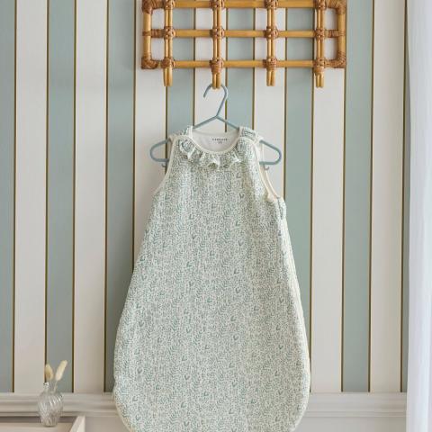 Gigoteuse à col volanté en gaze de coton biologique. Son indice CHALEUR est de 2 (TOG 2). Cet indice standard est idéal dans une chambre dont la température se situe entre 18 et 22 degrés. Fermeture par pressions épaules + glissière sur le côté pour un enfilage facile. 2 tailles au choix : 65 cm (0/6 mois) et 90 cm (6/