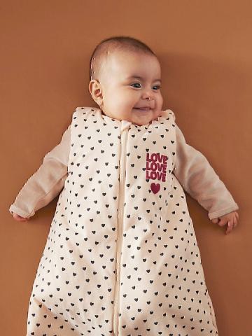 Une gigoteuse réversible pour changer de style au gré des envies ! D'un côté, une gaze de coton à motif léopard, et de l'autre un jersey de coton à motif coeurs. Un modèle douillet