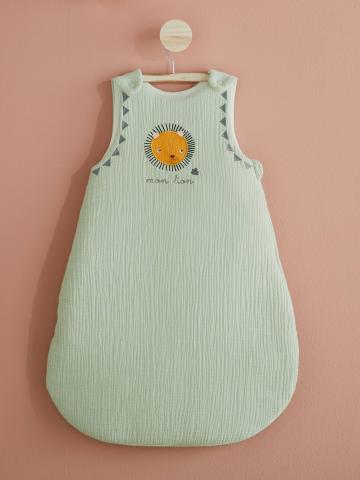 Les nuits de bébé seront douces avec cette gigoteuse en gaze de coton délicat. Pour veiller sur lui, un adorable petit lion le transportera vers les plus jolis rêves.