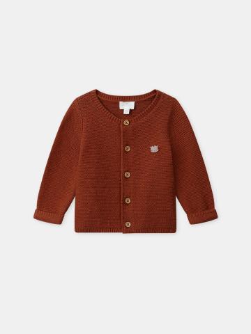 Gilet en point mousse en coton et laine de couleur brun caramel Ouverture avant intégrale avec boutons en bois naturel gravés "Sergent Major" Badge en résine castor sur le buste Vendu avec sa carte cadeau en forme de castor Ouverture avant intégrale par boutons