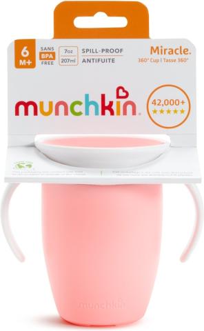 Tasse d'entraînement Miracle Cup 360 en rose avec un couvercle blanc.