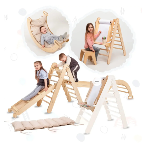 Échelle Triangulaire + Arche/Rocker + Toboggan/Rampe + Filet + Coussin + Ajout Artistique