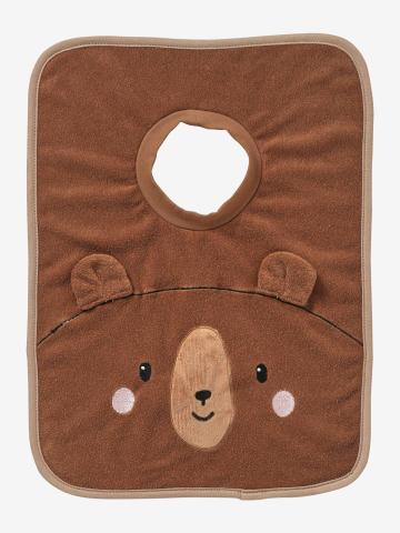 Un grand bavoir qui protège bien les vêtements durant les repas ! Décoré d'une petite bouille d'animal avec oreilles volantes et d'un joli biais imprimé, votre enfant va adorer l'enfiler !