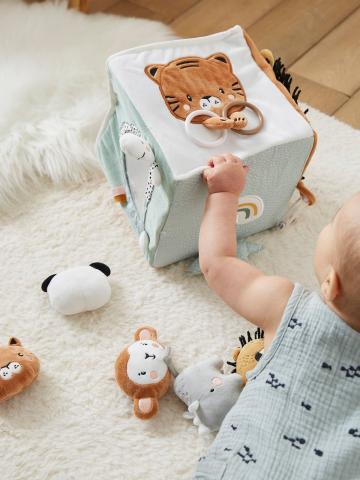Ce joli cube d'activités n'en a pas fini d'amuser bébé ! Miroir, textures différentes, jeux sur le thème de la jungle... en avant les découvertes !