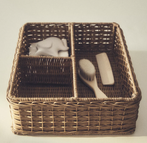 Corbeille de rangement en rotin pour enfant avec compartiments intérieurs.