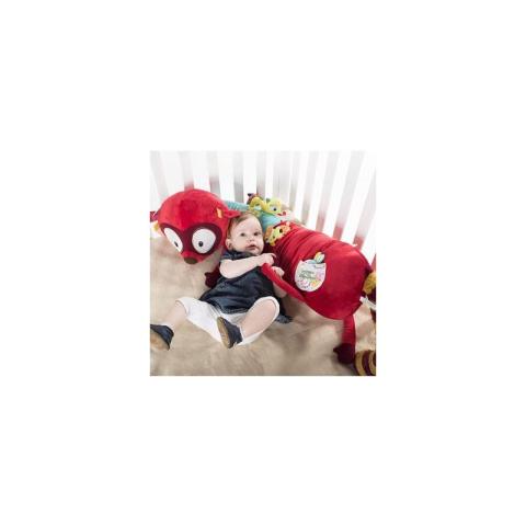 Destiné au parc pour bien caler bébé, ce polochon Georges grandira avec bébé et servira aussi de jouet d’éveil puis de décoration pour le lit "de grand". Lorsque bébé grandit, Georges lui révèle ses activités : un hochet dans sa tête, un miroir en forme de caméléon, un lion qui fait du hula-hoop, du bruit papier dans sa queue et un lapin caché dans sa poche.