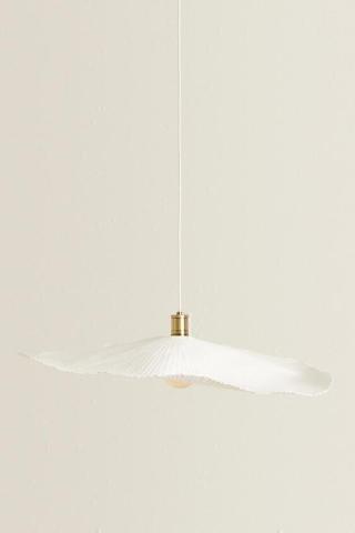 Lampe suspension avec double feuille de couleur écrue et détail doré.