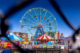 Moment de détente sur la péninsule de Brooklyn et sur l'une des attractions les plus populaires du lieu : la grande roue ou Wonder Wheel présente depuis 1920 et haute de plus de 45 mètres de haut.