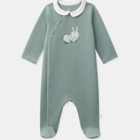 Pour les petits explorateurs dès la naissance, idéale pour les soirées printanières. En velours milleraies, enrichi de coton bio et fibres recyclées, ouverture avant arrondie par 3 boutons pression. Patch âne velours bleu pâle et broderies « Bonne nuit » pour un univers tendre et champêtre. Velours de couleur bleu gris