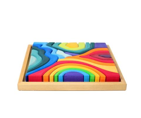Een prachtige houten blokkenset van Grimm`s. Aarde. Lucht. Vuur. Water. Elk van de vier elementen is vertegenwoordigd in deze bouwset. Deze kenmerkende bouwvormen, meer als golven of organische vormen dan traditionele geometrische blokken, creëren bergketens, kolkende oceanen, buitenaardse landschappen, kronkelende sne