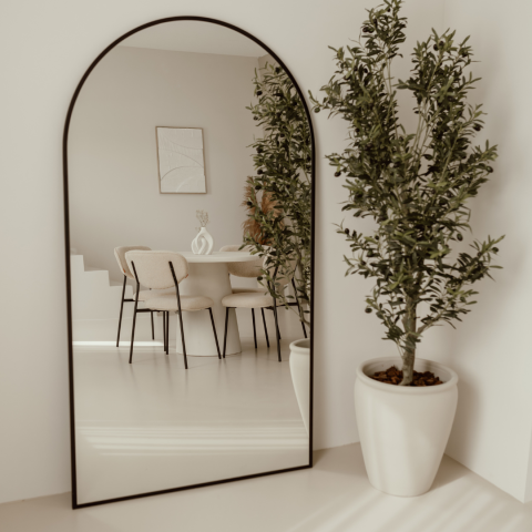Minimalistisch en krachtig — deze gebogen spiegel in mat zwart van 180x100 cm geeft je interieur een luxe en moderne uitstraling. Het slanke metalen frame en de afgeronde vorm zorgen voor een rustige balans tussen strak en elegant. Het royale formaat is perfect voor een volledige outfitcheck, zonder dat de spiegel veel