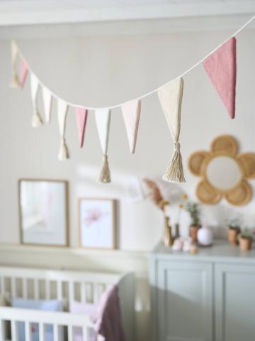 Accrochée dans ma chambre, cette belle guirlande amène beaucoup de douceur avec ses fanions en tricot.
