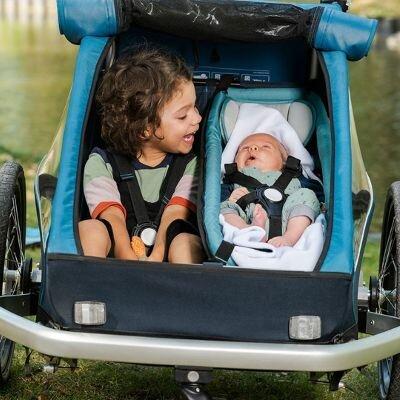 Nous avons déjà notre super charrette Thule double place qui peut être utilisée à l'arrière du vélo ou en grosse poussette tout terrain. Lio l'adore!