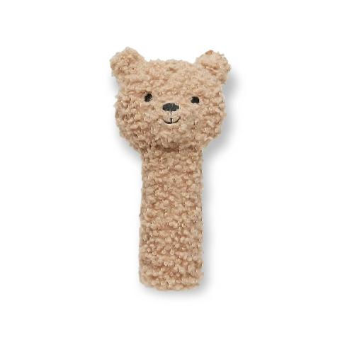 Un petit ourson en tissu bouclé qui contient un petit grelot pour amuser bébé quand il bouge le hochet. |CARACTÉRISTIQUES| • Tissu bouclé 100% polyester. Garnissage 100% polyester. Clochette métallique à l'intérieur.• 22cm x 9cm • Lavage à la main recommandé