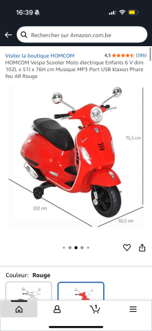 Ce produit est extrait d'une liste de cadeaux (Anniversaire, Noël, ...) déposée sur Kadolog. Kadolog permet de créer des listes de cadeaux (Anniversaire, Noël, ...) en toute liberté. Il est possible d'ajouter toutes vos envies cadeaux et de recevoir les dons directement sur votre compte. Avec les dons reçus, vous êtes alors libre d'aller acheter vos produits (comme ce 'HOMCOM Vespa Scooter Moto électrique Enfants 6 V dim. 102L x 51l x 76H cm Musique MP3 Port USB klaxon Phare feu AR Rouge ') où et quand vous le souhaitez.