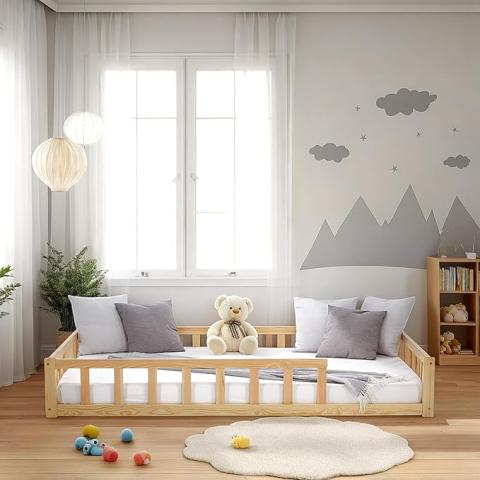 Homestyle4u 2839 - Lit de sol, 120 x 200 cm, Montessori en bois, naturel, pour enfant, avec protection anti-chute, sommier à lattes : Amazon.com.be: Bébé et Puériculture