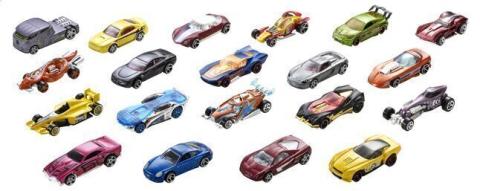 Ensemble de 20 voitures Hot Wheels comprenant aussi bien des voitures classiques que des véhicules de course.