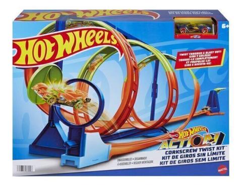 Fais sauter les voitures à travers la triple boucle ou directement à travers les cerceaux. Dose bien ta force pour atteindre la cible sur ce circuit très acrobatique Corkscrew Twist Kit de Hot Wheels.