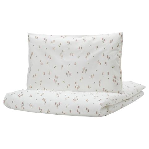 GULDVÄVARE housse couette+1 taie pour lit bébé, blanc/motif floral, 110x125/35x55 cm Cette housse de couette et cette taie d'oreiller blanches ornées de fleurs roses sont en coton certifié GOTS, une matière respirante qui absorbe l’humidité et est agréable pour la peau de bébé.