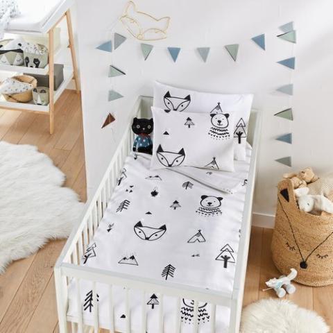 La housse de couette pour lit bébé pur coton FOREST CAMP, un imprimé de petits dessins naïfs et ravissants noirs sur fond blanc.