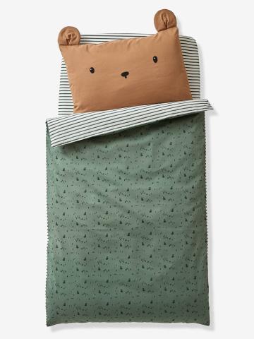 D'un côté la balade en forêt, de l'autre, un bel imprimé rayé ! Avec cette housse de couette, la chambre de bébé change de décor au gré vos envies ! 1 face verte avec imprimé ar