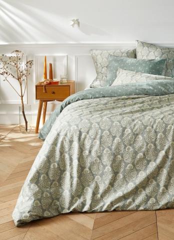 HOUSSE DE COUETTE EN SATIN IMPRIMÉ INDIEN THALER BLEU CLAIR : Apportez une note d’exotisme et d’élégance à votre chambre avec cette housse de couette en satin 100 % coton, 118 fils/cm². Son devant est sublimé par un imprimé floral d’inspiration indienne,