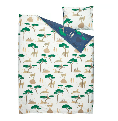 Sur un côté de cette parure de lit douce en coton et en viscose, il fait jour dans la savane et le guépard est éveillé et vigilant. De l'autre, la nuit est tombée et l'animal s'endort paisiblement.