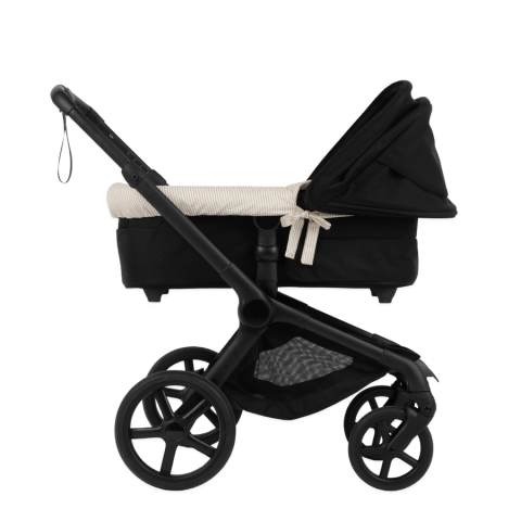 This is our carrycot cover for the Bugaboo Fox, Cameleon and Donkey. Minimal, just the way we like it. It fits perfectly in the carrycot and adapts both with or without the footmuff cover, thanks to its side ties and elastic edge. It covers the entire carrycot and goes under the mattress, so we recommend getting the ma