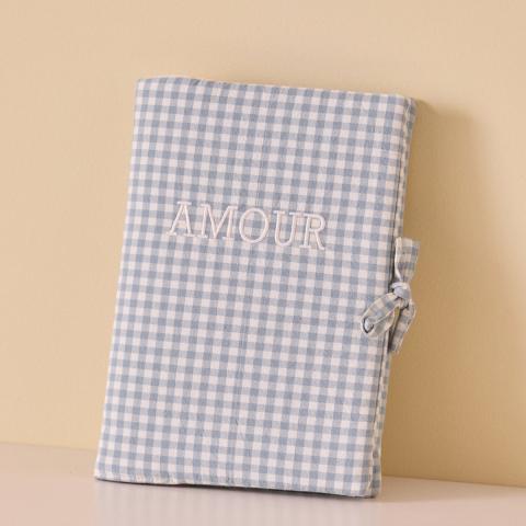 Housse molletonnée en gaze de coton vichy caramel pour protéger et habiller le carnet de santé. Avec broderie "Amour" devant, petite poche plaquée à l'intérieur et liens de fermeture. Dimensions standards 24 x 18 cm