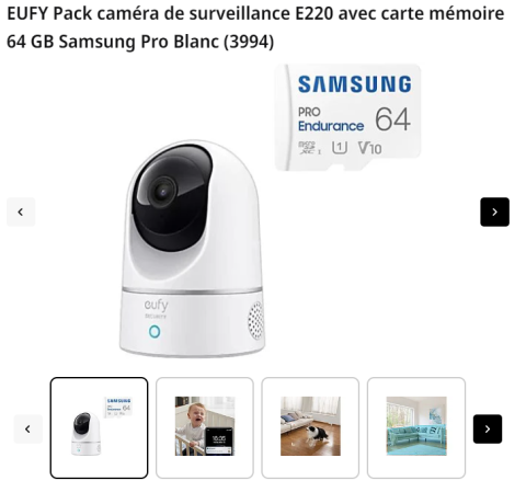 La caméra de surveillance Eufy E220 en blanc avec carte mémoire Samsung Pro de 64 Go est un ensemble pratique pour la sécurité de ta maison. Elle capture des images en qualité 2K d'une clarté cristalline. Son capteur intelligent détecte instantanément les mouvements entrant dans le champ de vision et distingue facilement les animaux des personnes. De plus, tu ne seras alerté que lorsque la caméra enregistre des événements à risque. Pour obtenir une meilleure vue de l'ensemble, tu peux faire pivoter la caméra à 360° à l'horizontale et 96° à la verticale. Communique avec des personnes ou des animaux domestiques par l'intermédiaire d'un système audio bidirectionnel. L'appareil est compatible avec Apple HomeKit, Google Assistant et Amazon Alexa.
