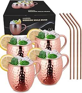 izdeel Verres Moscow Mule Tasses Cuivre Mugs 550ml Verres pour Cocktail, Rhum, Boissons Froides, Maison, Bar, Fête, La Saint Valentin, Anniversaire Cadeaux, (Poignée ronde(4 Tasses + 4 Pailles)) : Amazon.com.be: Mode