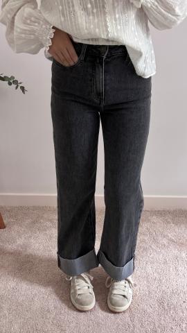 BESTSELLER Prenez votre taille habituelle. Il peut être légèrement serré au début, mais il se détend un peu avec le temps Jean gris taille haute avec ourlet  Coupe : wide Taille 34/36/38/40/42  Longueur : 96 à 100 cm  Largeur : 34 à 40 cm Le modèle mesure 1m60 et porte la taille 34