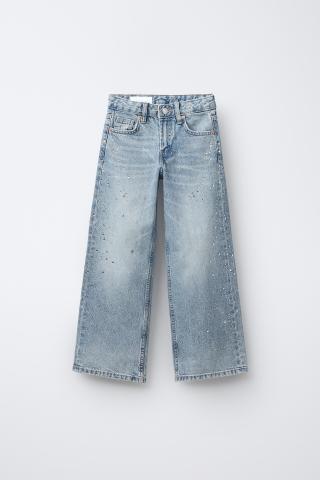 Jean coupe large avec taille réglable de l'intérieur et fermeture avant par bouton. Poches avant et poches plaquées au dos. Application brillante.
