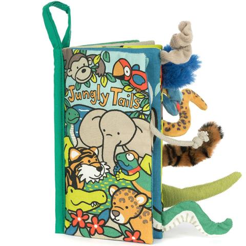 Het stoffen voelboekje 'Jungly Tails' van Jellycat heeft staartjes van jungledieren om te voelen en ontdekken. Voor 22.00 uur besteld, morgen in huis.