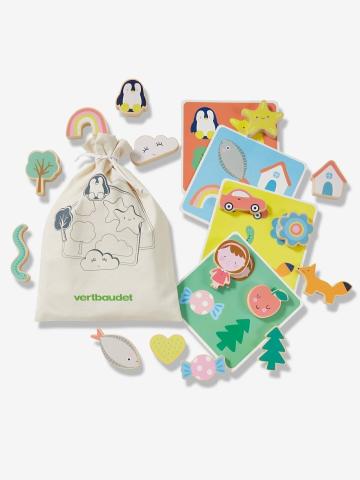 Jeu de reconnaissance tactile en bois FSC® multicolore - Un jeu sympa et coloré dont voici la règle : chacun prend une plaquette de jeu et la pose devant soi. L'enfant doit piocher un des éléments du pochon et deviner
