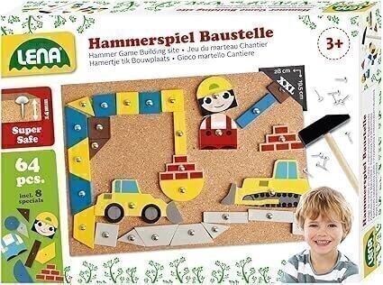 Lena 65828 Construction Hammer Set with 64 Coloured Pieces and 8 Construction Pieces, Cork Base Plate 28 x 19.5 cm, Hammer and Nails, for Children from 3 Years Old : Amazon.fr: Toys & Games