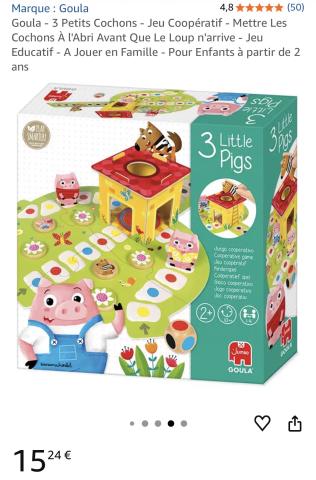 Ce produit est extrait d'une liste de cadeaux (Anniversaire, Noël, ...) déposée sur Kadolog. Kadolog permet de créer des listes de cadeaux (Anniversaire, Noël, ...) en toute liberté. Il est possible d'ajouter toutes vos envies cadeaux et de recevoir les dons directement sur votre compte. Avec les dons reçus, vous êtes alors libre d'aller acheter vos produits (comme ce 'Jeu des 3 petits cochons ') où et quand vous le souhaitez.