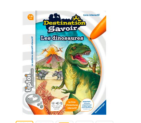 Ce produit est extrait d'une liste de cadeaux (Anniversaire, Noël, ...) déposée sur Kadolog. Kadolog permet de créer des listes de cadeaux (Anniversaire, Noël, ...) en toute liberté. Il est possible d'ajouter toutes vos envies cadeaux et de recevoir les dons directement sur votre compte. Avec les dons reçus, vous êtes alors libre d'aller acheter vos produits (comme ce 'Jeu éducatif Ravensburger Tiptoi Destination Savoir Les dinosaures ') où et quand vous le souhaitez.