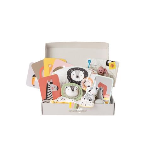 LIVRAISON COMPRISE - Le cadeau de maternité parfait ! Cet ensemble contient une gamme complète des premiers jouets dont bébé a besoin : un oreiller moelleux pour passer du temps sur le ventre, cinq cartes recto-verso avec des illustrations vibrantes et contrastées (y compris un support pratique), un miroir sûr spécialement pour les bébés, un adorable lion un doudou, un anneau crépitant et un lionceau crépitant. Ce kit spécial est conçu pour stimuler les sens et l'intelligence émotionnelle de bébé, l'apaiser et le détendre, contribuant ainsi au développement visuel dès les premiers jours.