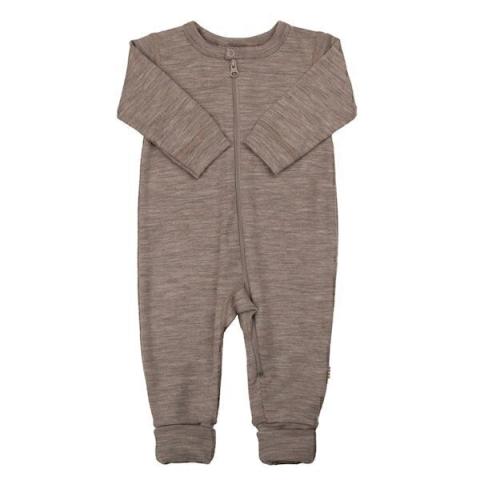 Pyjama doux et léger en laine mérinos et soie, thermorégulateur et extensible, avec zip pratique et bas de jambes retroussables. Coloris beige.