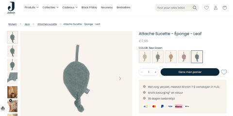 Ce produit est extrait d'une liste de naissance déposée sur Kadolog. Kadolog permet de créer des listes de naissance en toute liberté. Il est possible d'ajouter toutes vos envies cadeaux et de recevoir les dons directement sur votre compte. Avec les dons reçus, vous êtes alors libre d'aller acheter vos produits (comme ce 'Jollein attache tetine ') où et quand vous le souhaitez.