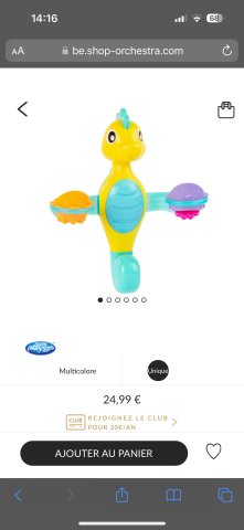Ce produit est extrait d'une liste de naissance déposée sur Kadolog. Kadolog permet de créer des listes de naissance en toute liberté. Il est possible d'ajouter toutes vos envies cadeaux et de recevoir les dons directement sur votre compte. Avec les dons reçus, vous êtes alors libre d'aller acheter vos produits (comme ce 'Jouet de bain - Hippocampe avec jet d'eau ') où et quand vous le souhaitez.