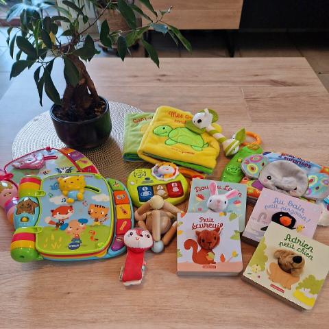Lot de jouets et livres d'éveil.