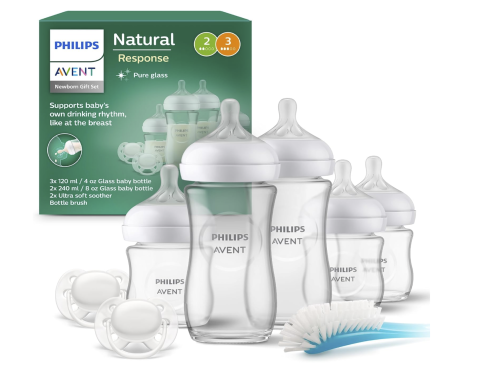 Le kit comprend : 3 biberons en verre de 120 ml, 2 biberons en verre de 240 ml (avec tétines de débit 2 et débit 3), 2 sucettes ultra-douces Philips Avent pour bébés âgés de 0 à 6 mois (0% BPA) et un goupillon pour biberon