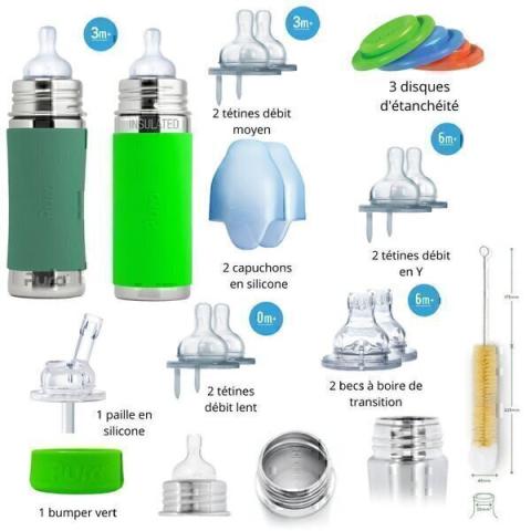Lâessentiel zéro déchet à ne pas oublier si vous partez en voyage avec votre tout petit ! Prévus pour être utilisés dès la naissance de votre enfant et suivre son évolution, sâadaptant à sa demande, ces biberons sont durables et solides. Grâce au bumper anti-choc et à sa composition en inox, il ne cassa pas au moindre
