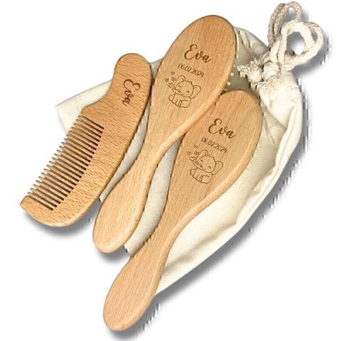 Notre kit bébé personnalisé contient deux brosses bébé (une brosse à picots et une brosse à poils ultra douce) ainsi qu'un peigne. Un cadeau personnalisé (prénom, date de naissance et 44 motifs au choix) parfait pour des soins capillaires quotidiens. - SANS date de naissance