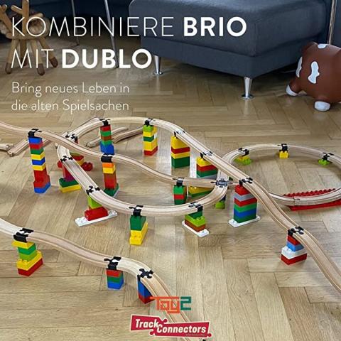 Des connecteurs de voie pour pouvoir faire tenir les rails de train en hauteur grâce aux blocs Duplo.
