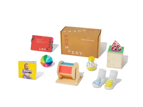 La sensorialité de bébé se développe Lovevery lui propose dans le Kit de jeu le Sensitif une Balle de Préhension, un Culbuto, et pleins d'autres jouets Montessori nouvelles générations