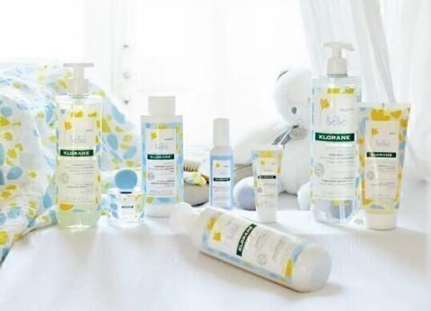 kit de soins Klorane Bébé gamme bio : lait de toilette, eau nettoyante, liniment, crème hydratante, huile multiusage, lingettes, gel lavante, talc, crème change.